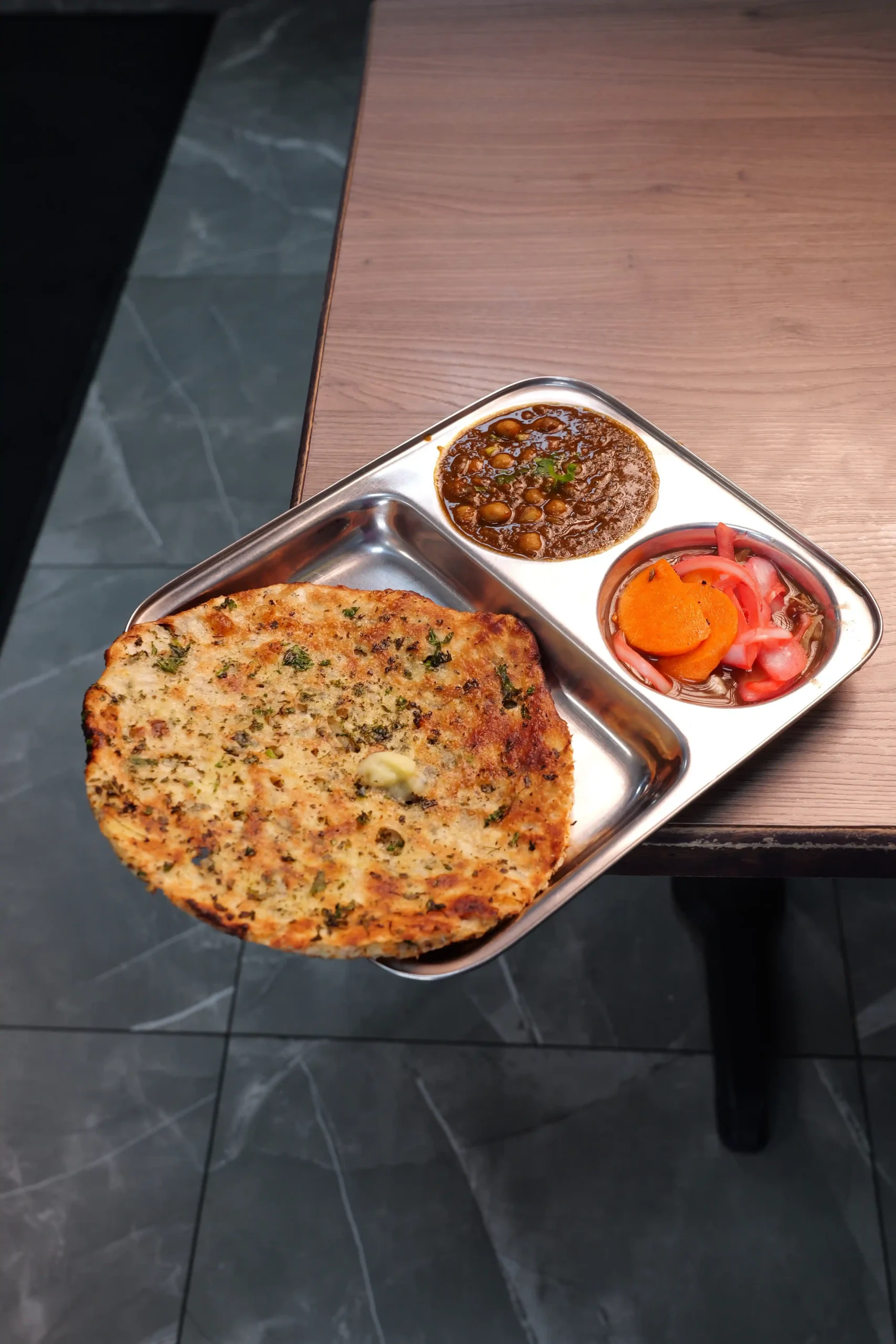 <p>Stuffed with ambarsari herbs & spices served with chole, dahi, special imli chutney and pickles.</p>